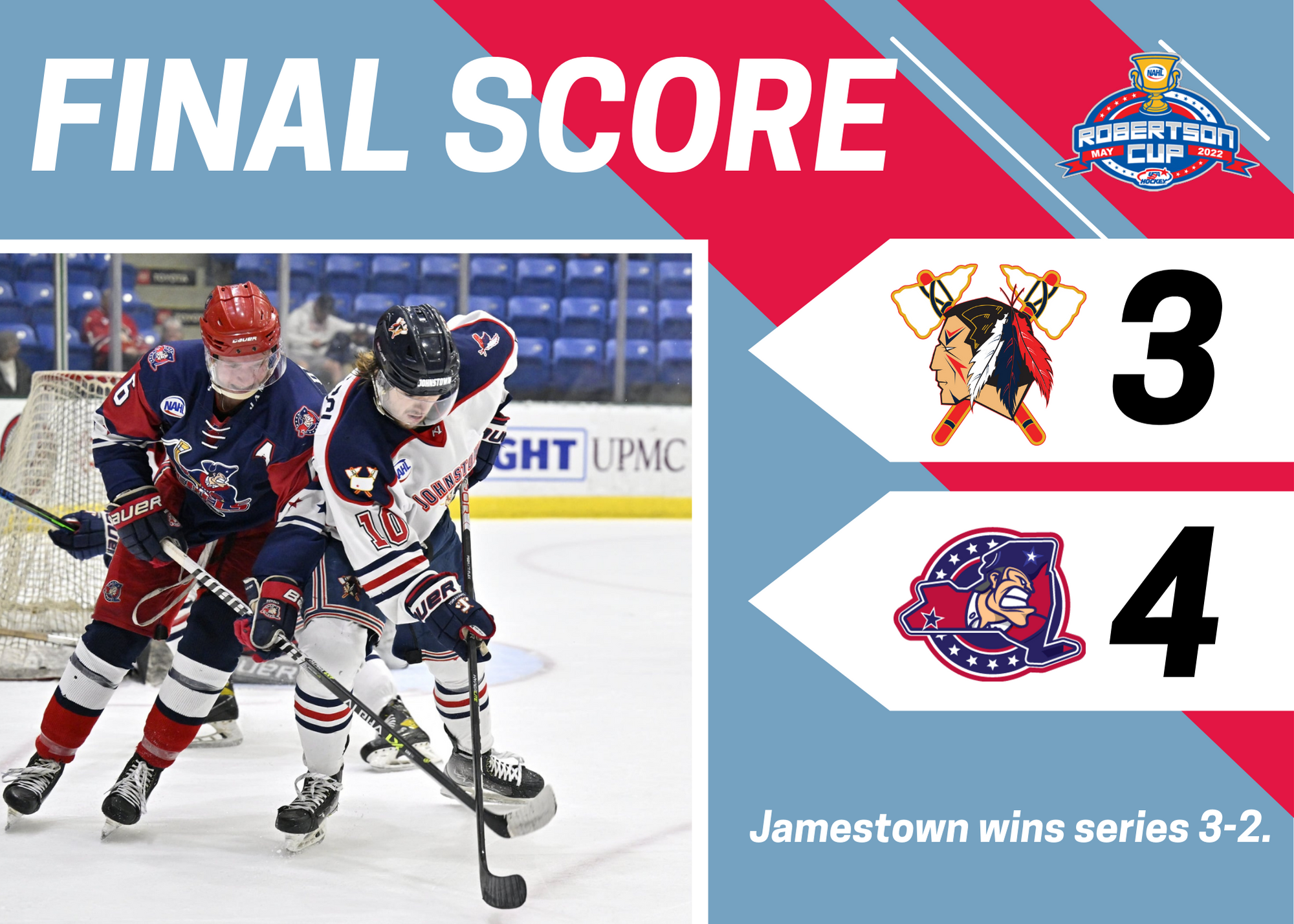 The Jamestown Rebels defeated the Johnstown Tomahawks 4-3 in overtime Sunday night, winning in game five advancing to the East Division Final.