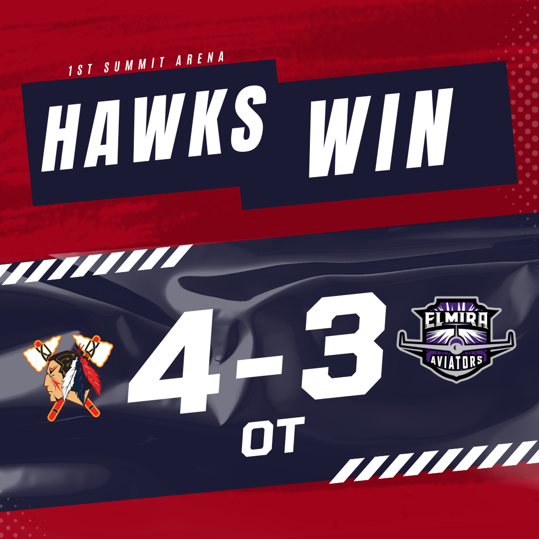 JOHNSTOWN – The Johnstown Tomahawks (11-7-3) defeated the Elmira Aviators (8-10-3) by a score of 4-3 in overtime for the second straight night at 1ST SUMMIT Arena on Saturday, November 15th. Nick Jarmain scored the game-winning goal in overtime for the Tomahawks. Emerson Marshall scored his 12th of the season, Kirby Perler got his first back with the Hawks and defenseman Cam Ross scored his first goal as a Tomahawk.