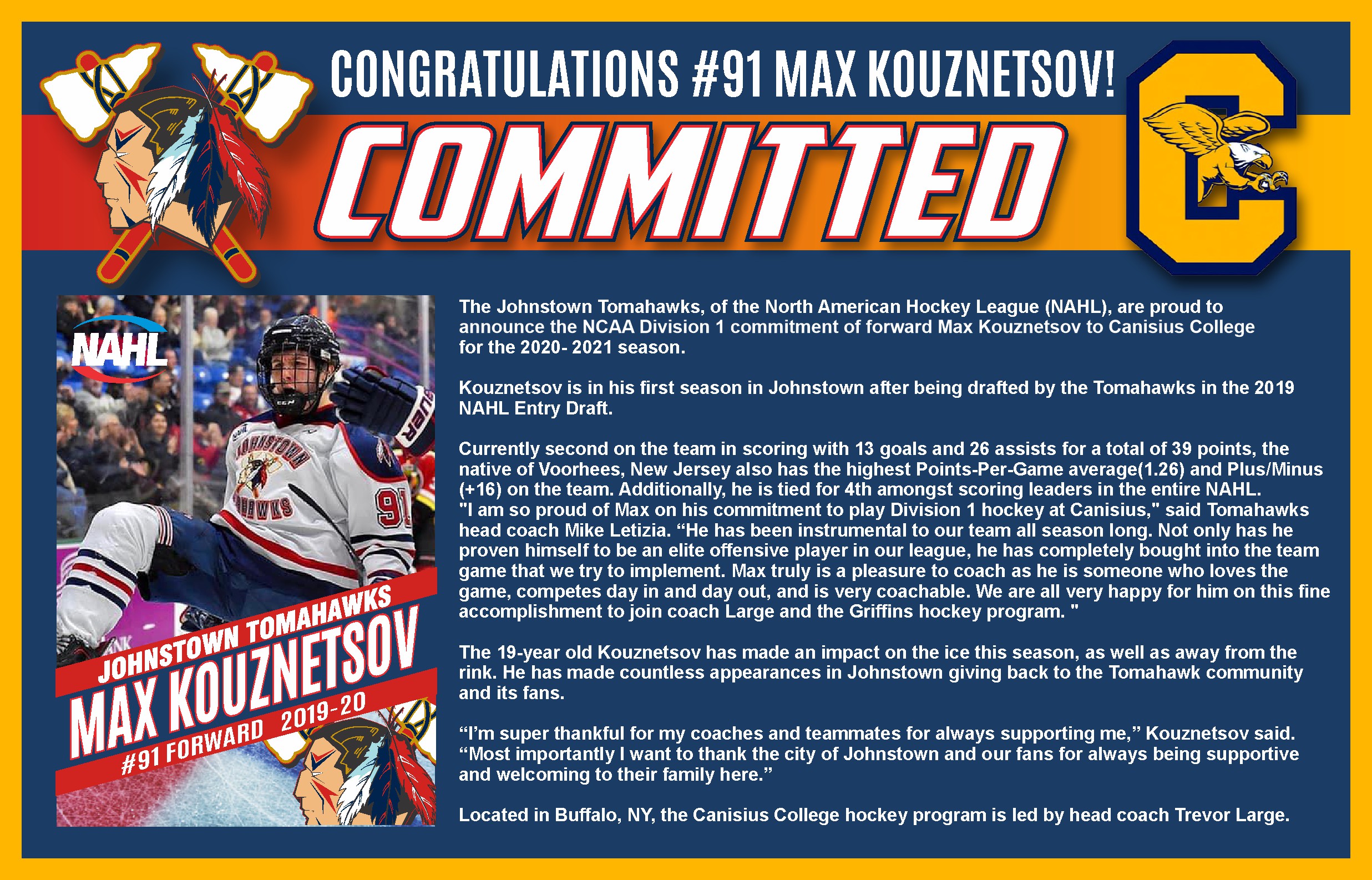 The Johnstown Tomahawks, of the North American Hockey League (NAHL), are proud to announce the NCAA Division 1 commitment of forward Max Kouznetsov to Canisius College for the 2020- 2021 season.