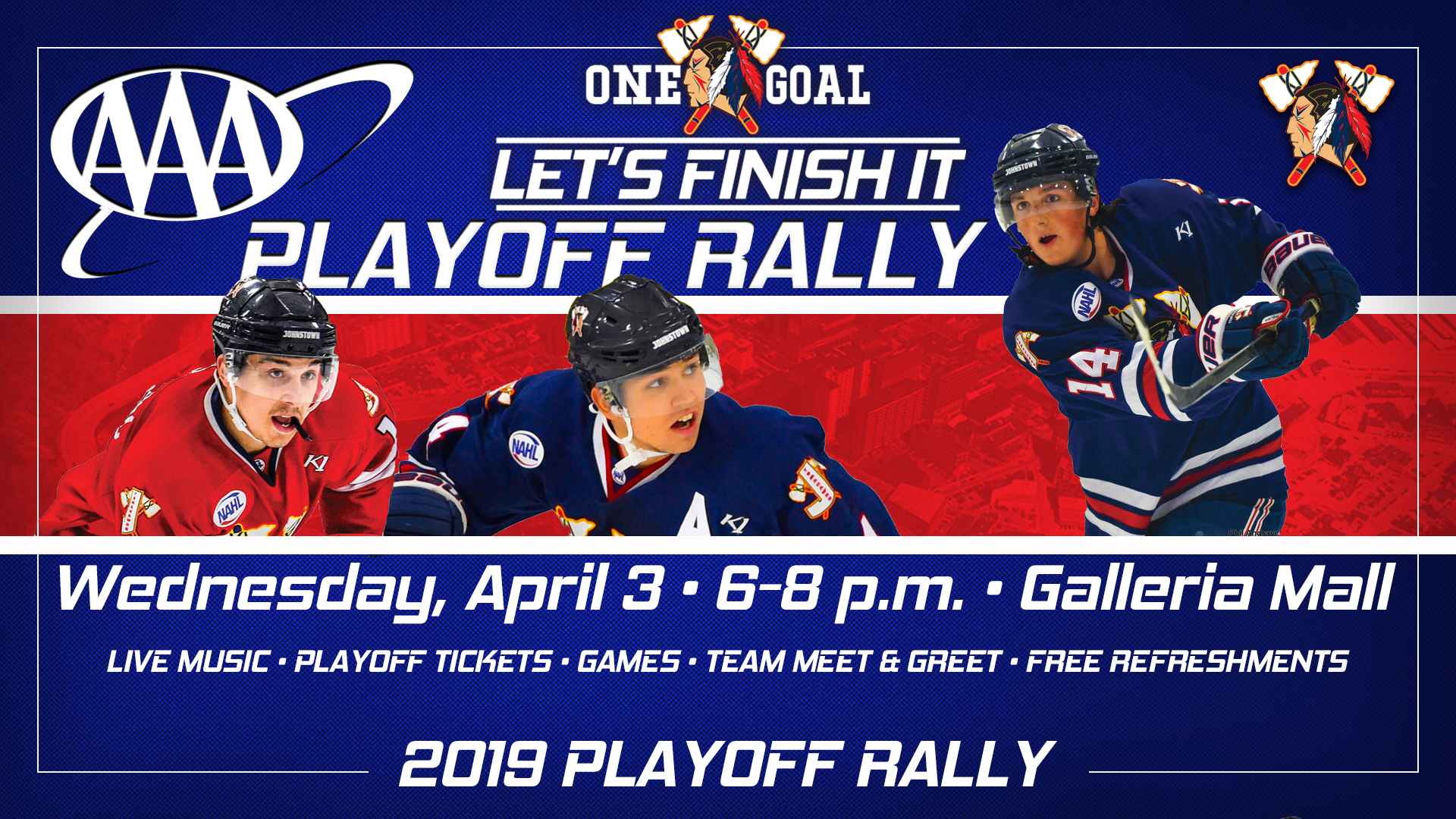 JOHNSTOWN – The Johnstown Tomahawks, in partnership with AAA, will host a playoff rally at the Galleria Mall on Wednesday, April 3 from 6:00 to 8:00 p.m. for fans to come cheer on the team in preparation for their 2019 Robertson Cup Playoff run.