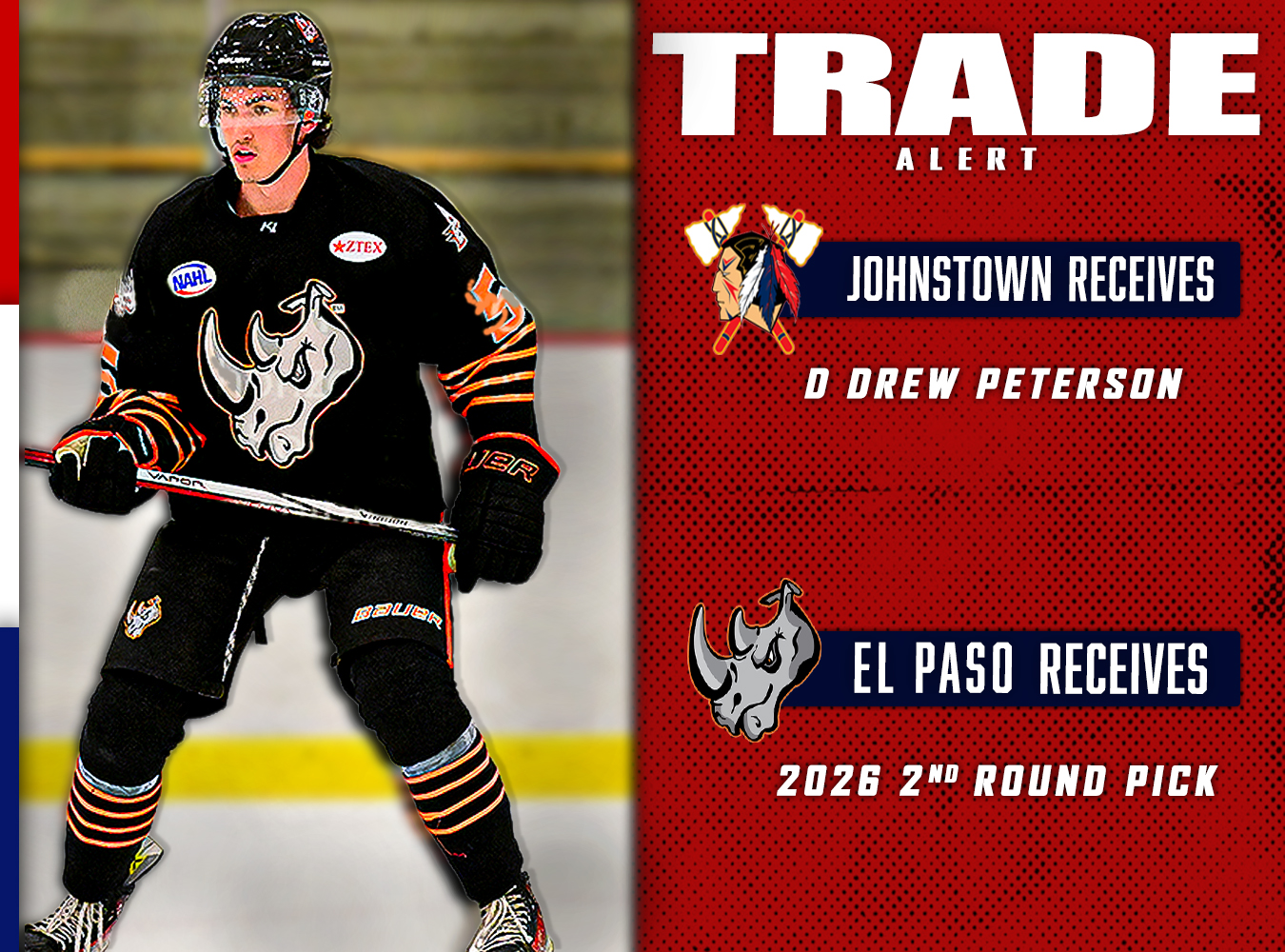 Johnstown, PA — The Johnstown Tomahawks have acquired defenseman Drew Peterson (2006, 6’3”, Right Defense) from the El Paso Rhinos in exchange for a 2026 second-round draft pick.
