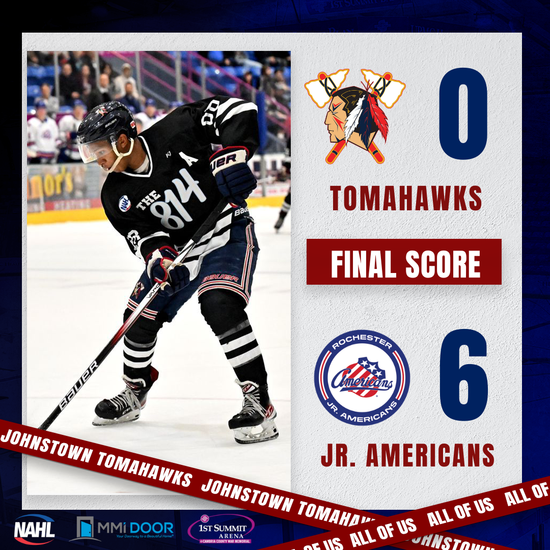 The Johnstown Tomahawks were defeated by the Rochester Jr. Americans by a final score of, 6-0.